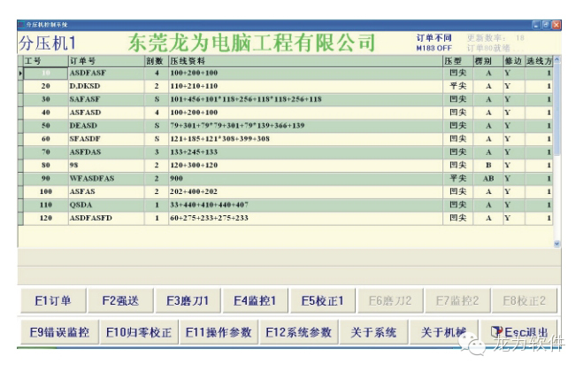 訂單功能:含輸入,修改,刪除及發(fā)送功能,可選(雙尖,平尖,凹尖)三種壓型。排刀監(jiān)控功能:實時監(jiān)控正在生產(chǎn)中的刀線設(shè)定位置及實際位置,當設(shè)定位置與實際位置有誤差時,可以微調(diào)校正。